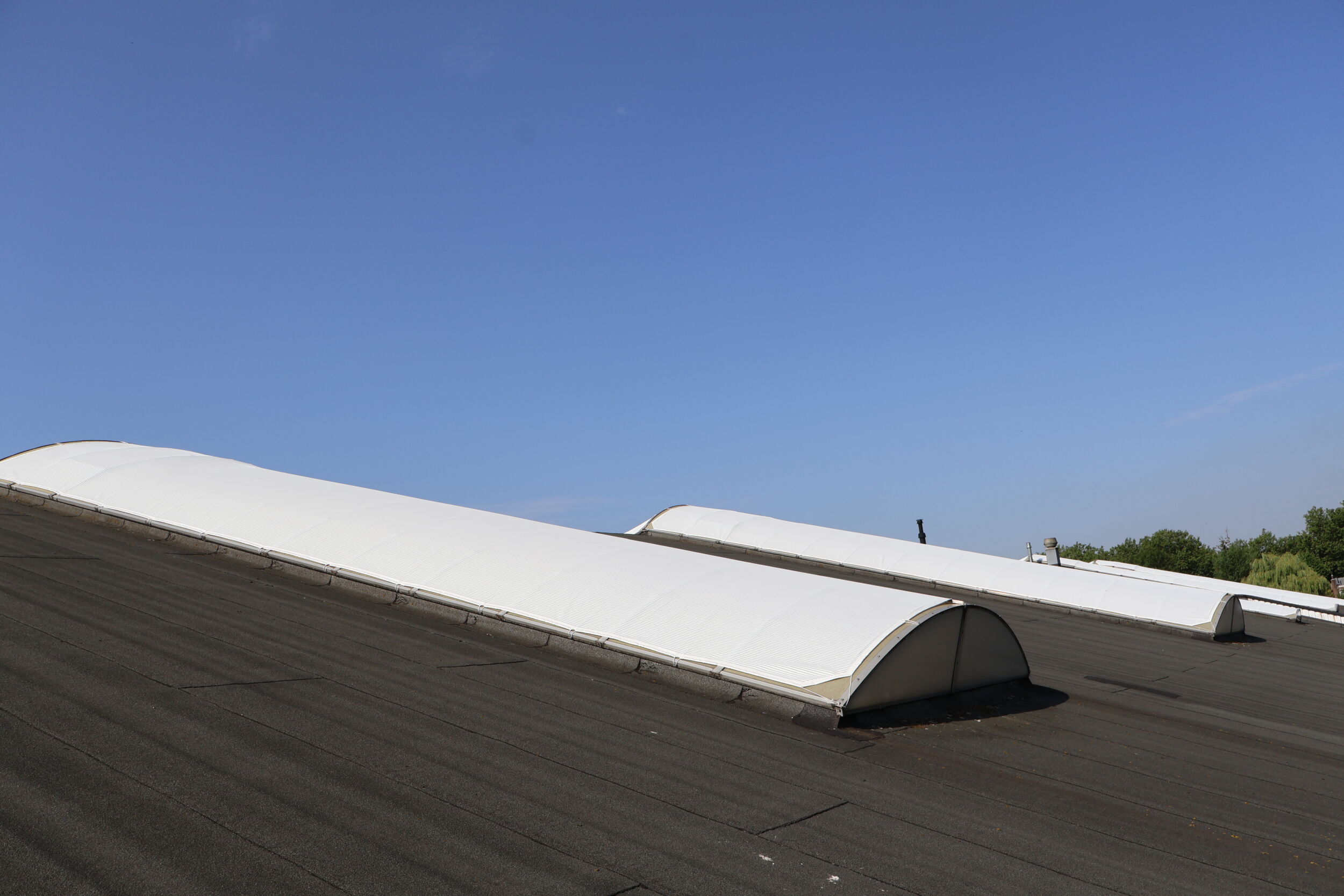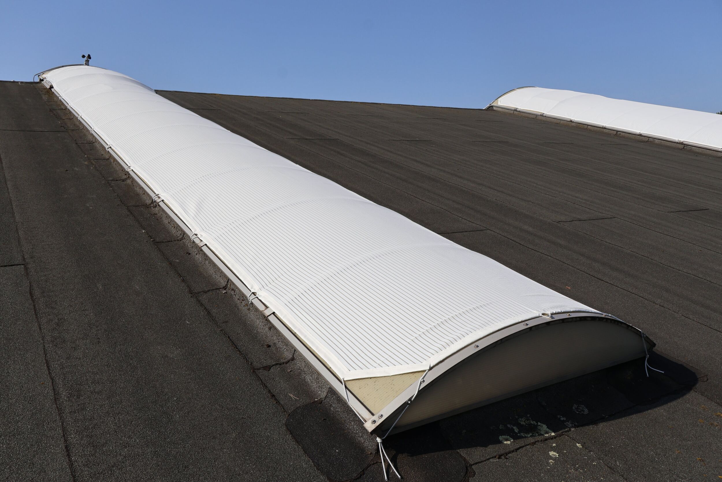 We hebben twaalf op maat gemaakte Heatshield schermdoeken geplaatst op de lichtstraten boven de banen. De schermdoeken laten het daglicht binnen, maar houden de warmte tegen. Hierdoor blijft de hal licht, fris en aangenaam, ook op warme zomerdagen.